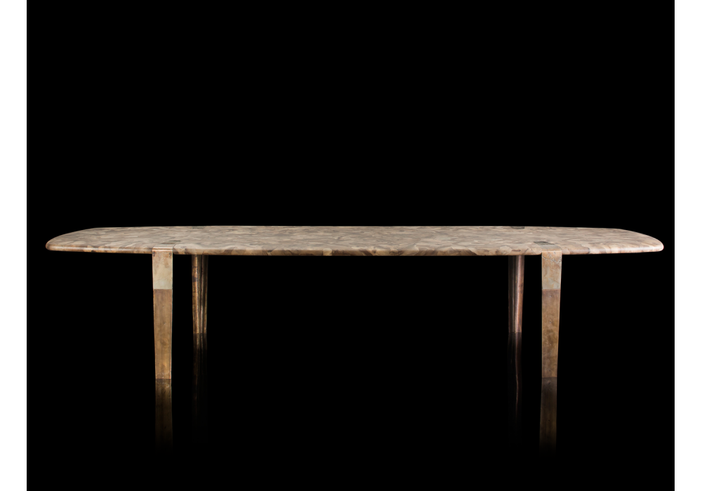 Oxymoron designed by Massimo Castagna for Henge is a quadrangular table with rounded corners and a wooden top. The structure is in black steel with legs in a bronze finish. Oxymoron is available in different sizes and finishes.