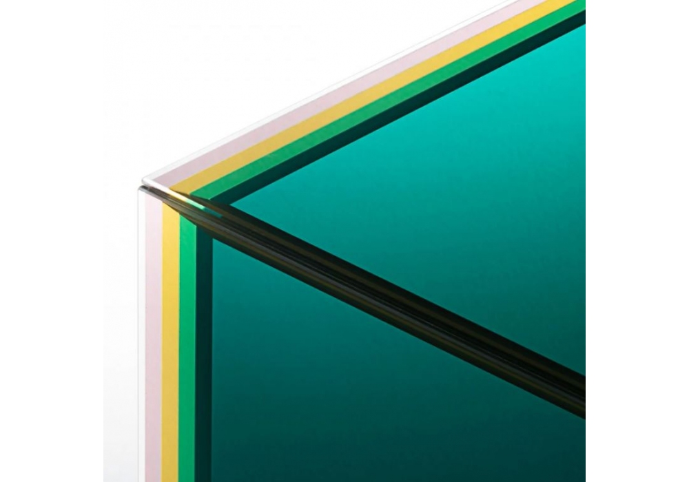 Bisel designed by Patricia Urquiola for Glas Italia is a table made in multi-layered and multichromatic glass, created by laminating five slabs of 5 mm extralight glass each with a different coloured film.