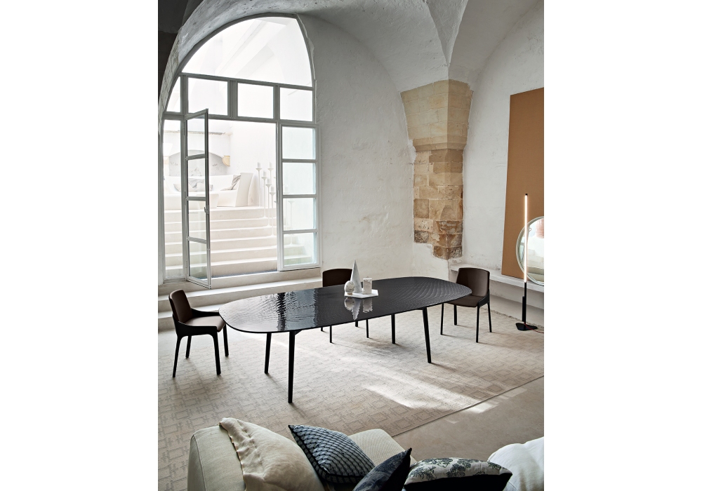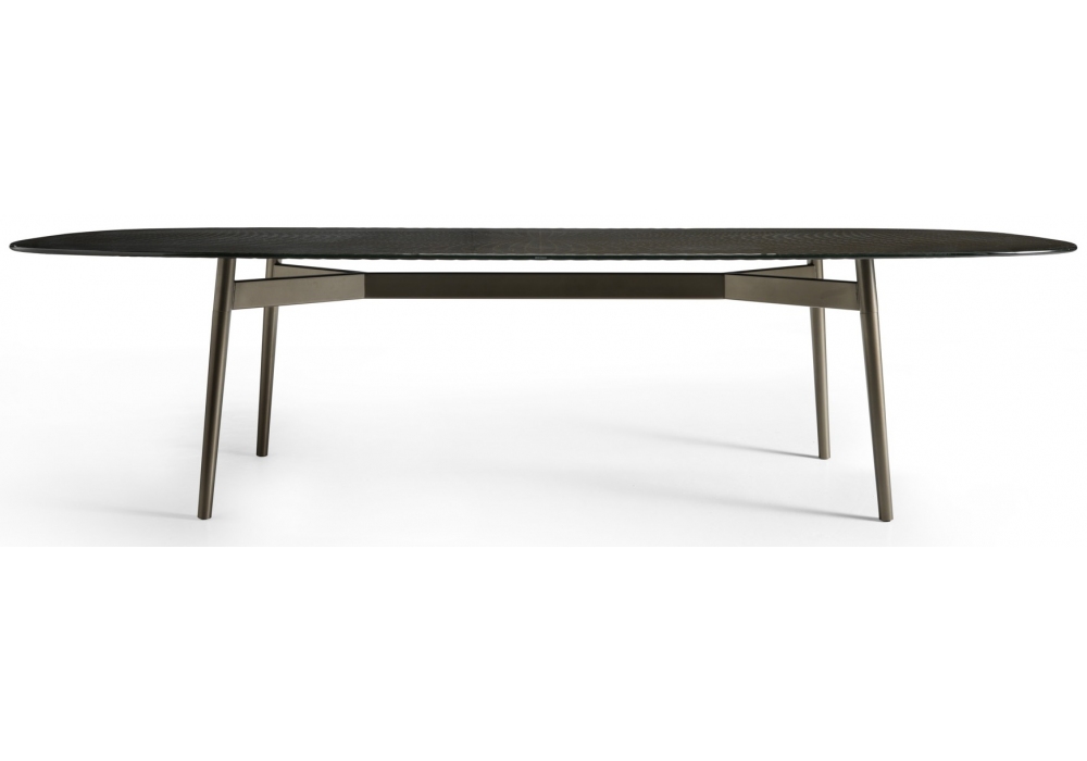 Coral Beach designed by Mac Stopa for Fiam is a table with top in fused and tempered glass, available transparentor back-lacquered with metallic paints. Base in Lava Grey or metallic Greige painted metal.