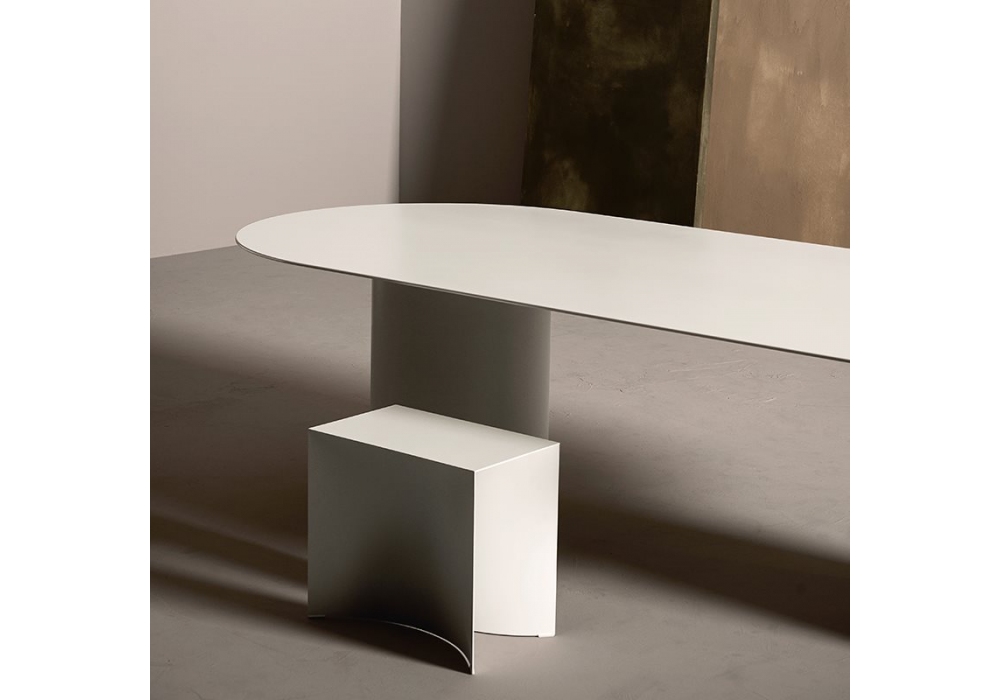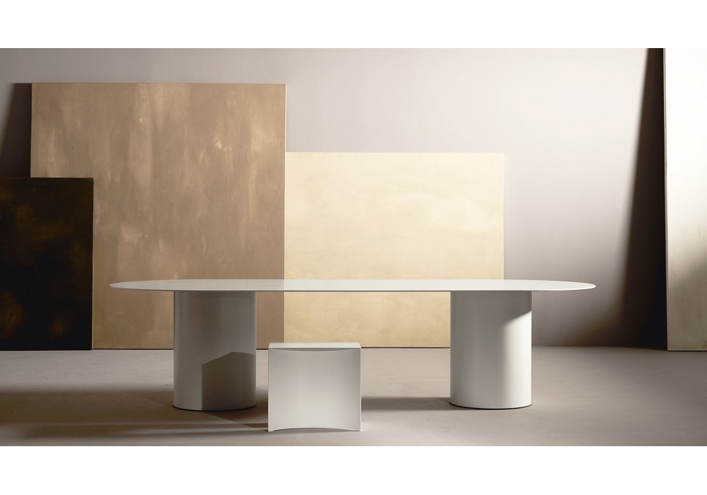 MM8 designed by Guglielmo Poletti for Desalto is a lacquered table with 8mm aluminum top and double cylindrical base covered in aluminum sheet. Available in 2 sizes.