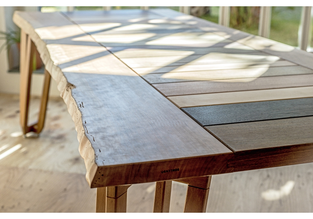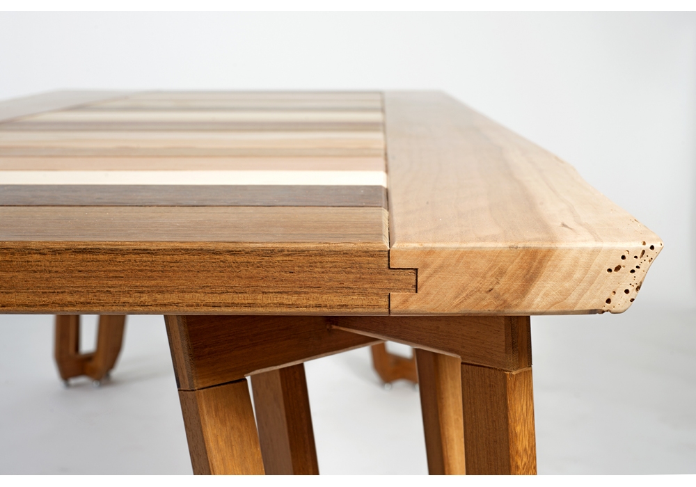 Forma Undici designed by Salvatore Longo for Ornythos is a wooden dining table, with the slatted top of different wood species: wenge, doussier, amazaque, pine, chestnut, maple, purple, iroko, cherry.