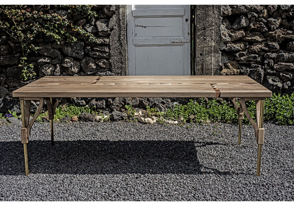 Forma Quindici designed by Salvatore Longo for Ornythos is a wooden dining table, with brass and wood bases, while the top is in walnut with chestnut, wenge, maple, doussie, purple, elm, iroko, amazaque inlays.