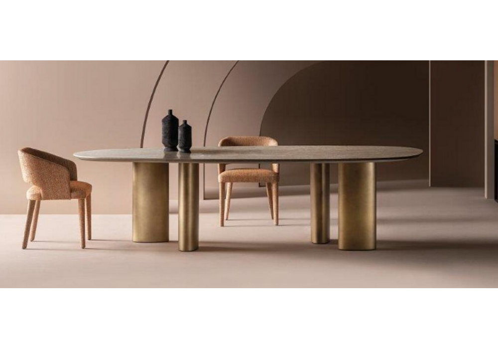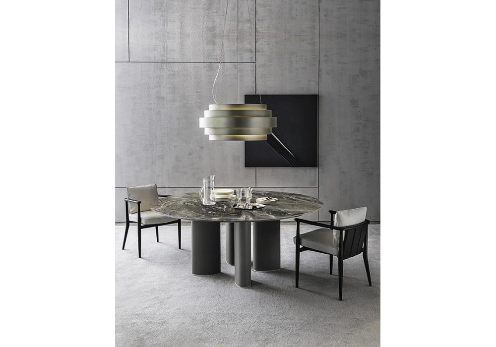 Arne designed by Roberto Lazzeroni for Casamilano is a table with top made of marble and undertop in lacquered MDF. The oval legs are covered in leather, lacquered or in flamed ash.