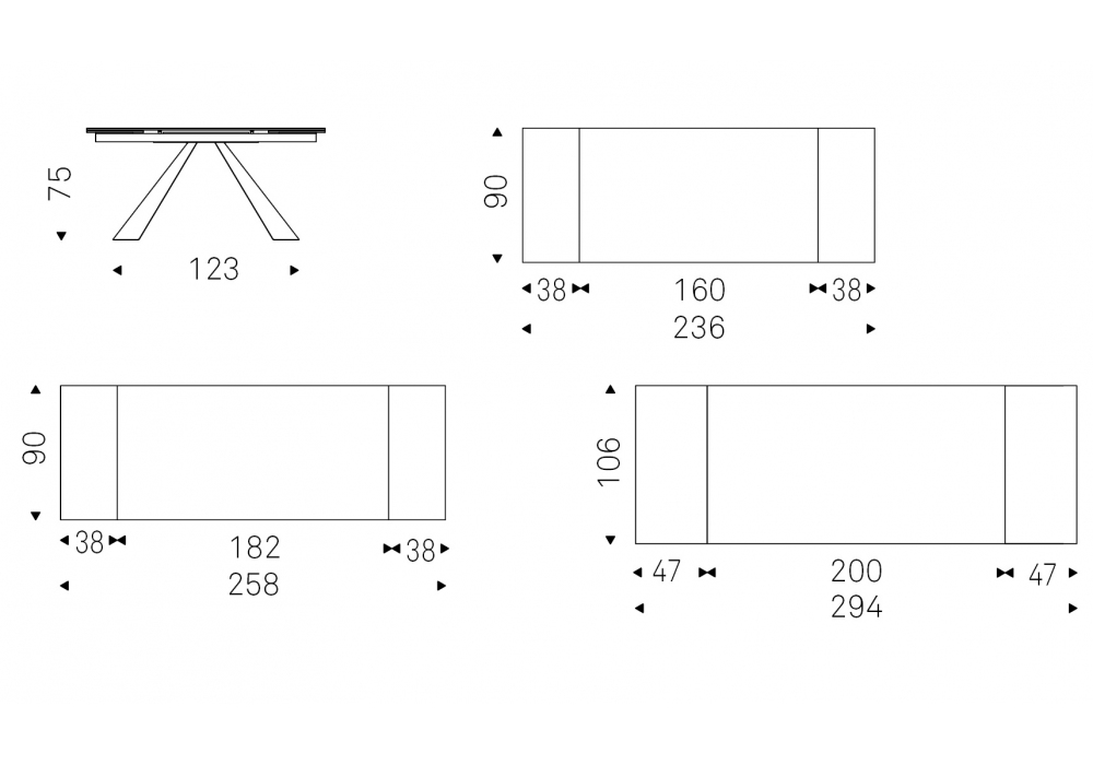 | Dimensions | 160→236 x 90 x H 75 cm; 182→258 x 90 x H 75 cm; 200→294 x 106 x H 75 cm. |