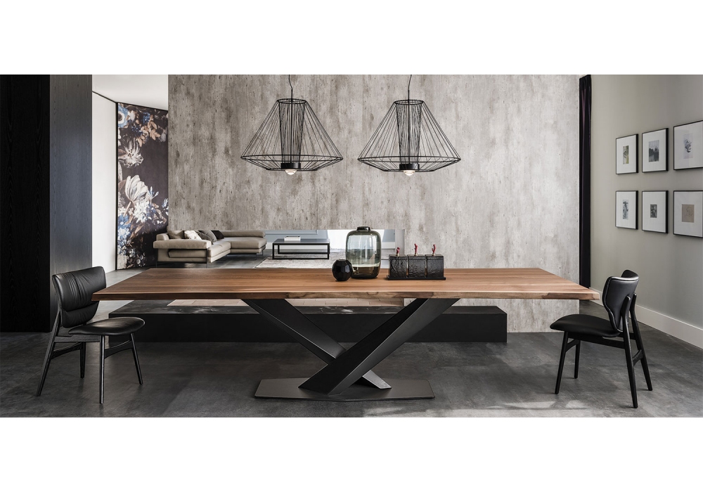 Stratos Wood designed by Studio Kronos for Cattelan Italia is a table with base in embossed lacquered steel. Top S version 4cm thick with irregular solid wood edges in Canaletto walnut, burned oak or natural oak. Version "A": top with angled edges in Canaletto walnut, burned oak or natural oak. Wooden top 4cm on 200x100 version and 5cm on 240x120 and 300x120 versions. Vesion "B": barrel top with angled edges in Canaletto walnut or burned oak. "Masterwood" version: boat shaped top in Canaletto walnut or Burned Oak made of diagonal wooden planks of different sizes. Oblique and rounded edges.