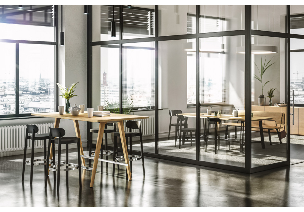 1510 designed by Wolfgang C.R. Mezger for Thonet is a high table with legs in light lacquered or black stained solid oak, chromed footrest. Top in blockboard with real wood veneer, laminate or ThonetDur®, squared corners. The table is also available in two sizes.