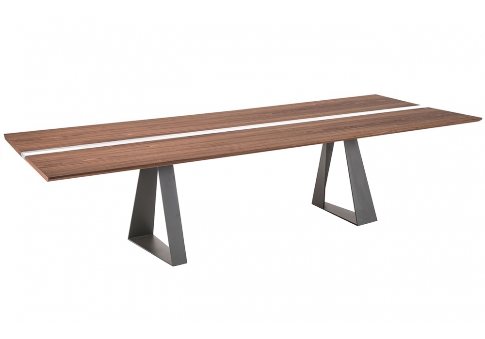 River designed by Daniele Molteni for Cattelan Italia is a table with steel base, extraclear glass insert and top in canaletto walnut or oak. Available in three sizes.