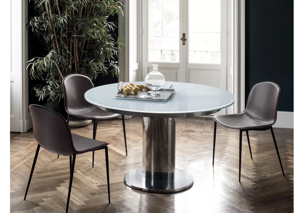 Giro designed by Enio Calosi & Amedeo De Maria for Bontempi is an extendable table with metal structure available with legs or column base. Different finishes are available.