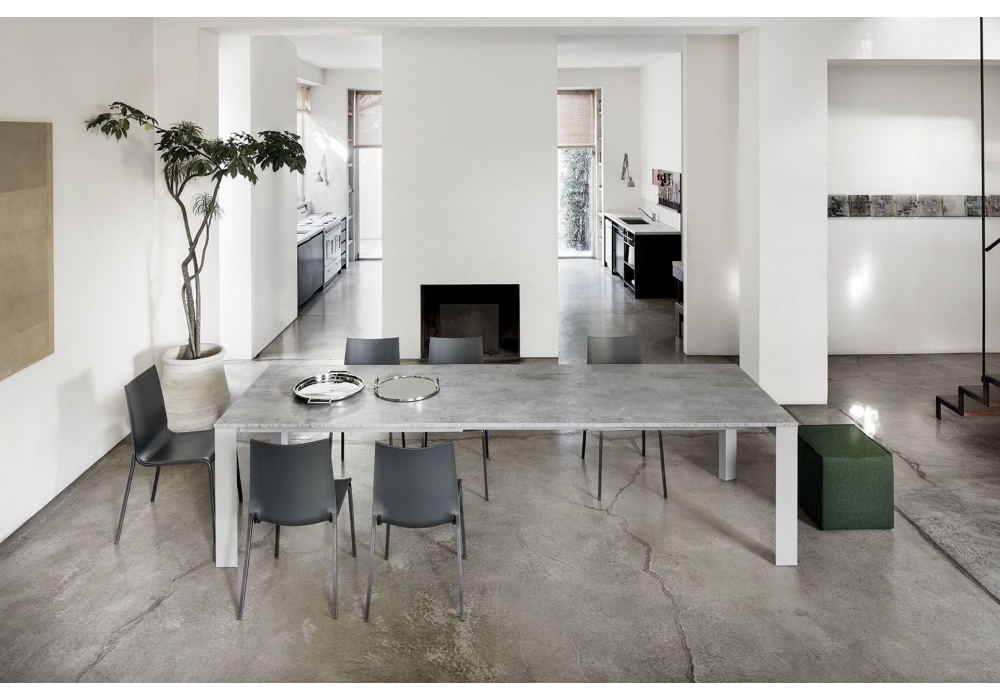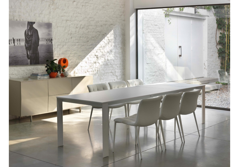 Pascal designed by R&D Bontempi Casa is an extensible table with structure in lacquered steel and top in melaminic, wood, crystal, ceramic or scratchproof available in two sizes. Different finishes are available.
