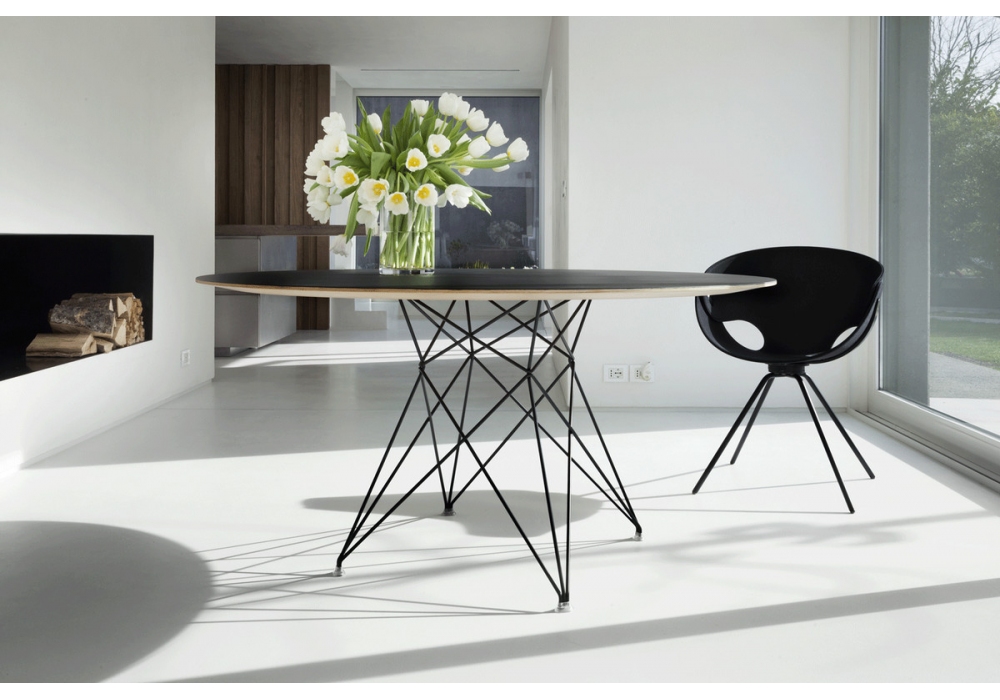 Arcos designed by Pascal Mourgue for Tonon is a round table with structure in steel rod painted in matt black. The top is available in linoleum or oak, in different sizes.