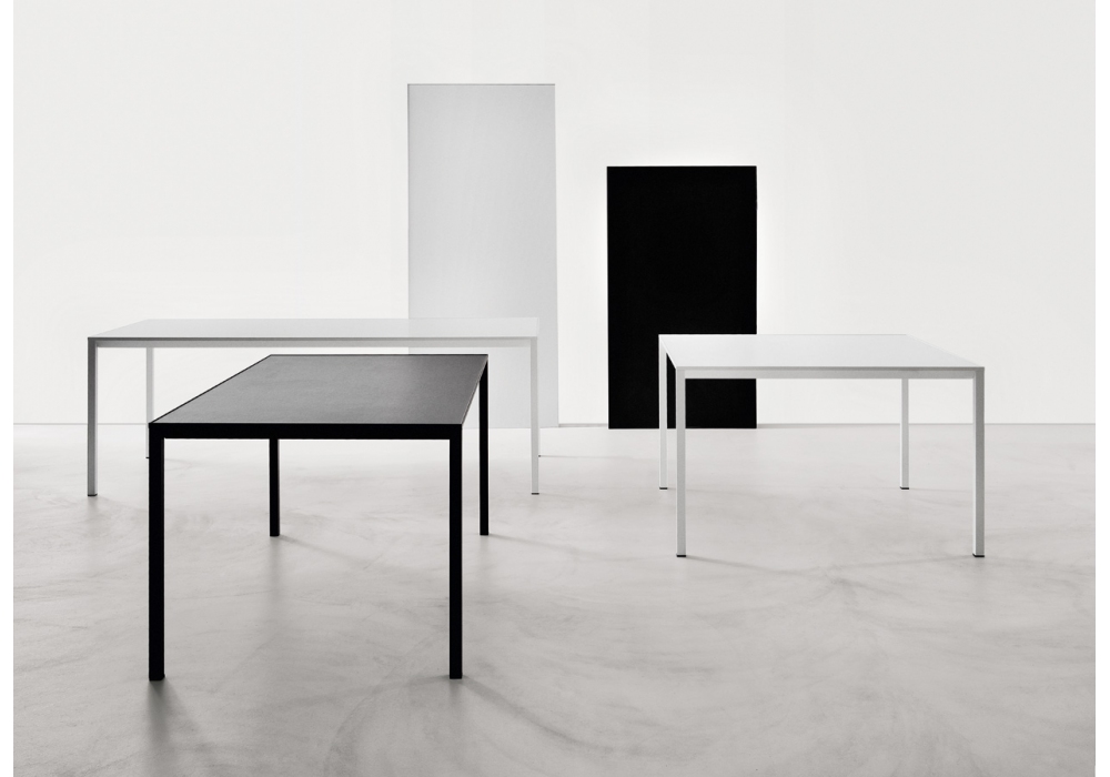 Frame designed by Romano Marcato for Lapalma is a table with frame entirely in white powder coated aluminum in various sizes. 10 mm HPL laminate top. in white or bleached oak.