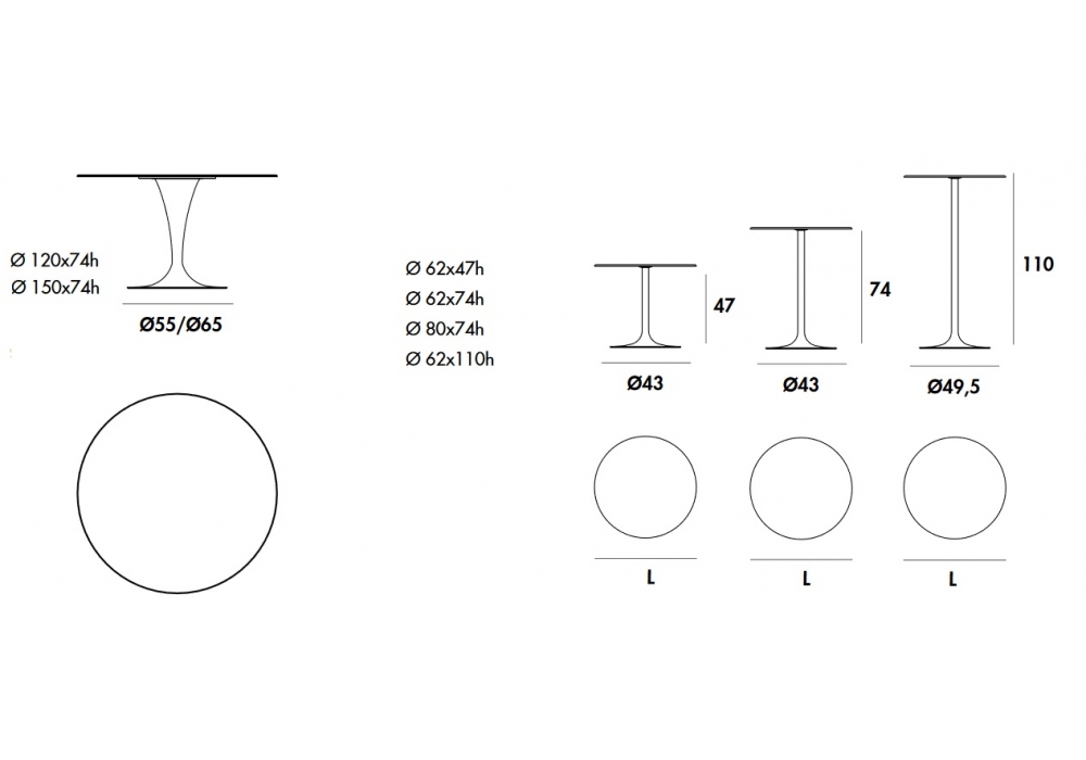 | Dimensions | Ø 62 x H 47 cm; Ø 62 x H 74 cm; Ø 80 x H 74 cm; Ø 62 x H 110 cm; Ø 120 x H 74 cm; Ø 150 x H 74 cm |