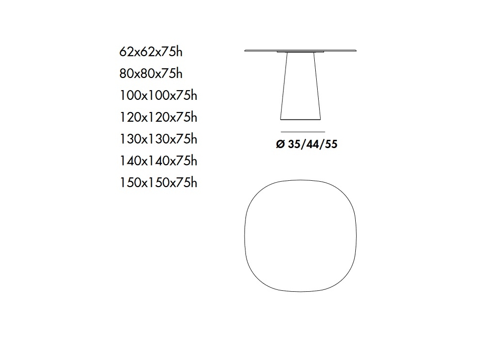 | Dimensions | 62 x 62 x H 75 cm; 80 x 80 x H 75 cm; 100 x 100 x H 75 cm; 120 x 120 x H 75 cm; 130 x 130 x H 75 cm; 140 x 140 x H 75 cm; 150 x 150 x H 75 cm |