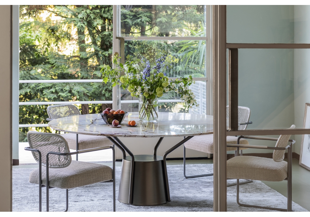 Balloon designed by Volodymyr Karalyus for Natevo is a round table with structure and base in anodized bronze. Marble top available in different finishes. Offered in two sizes. It is possible to combine the Lazy Susy tray.
