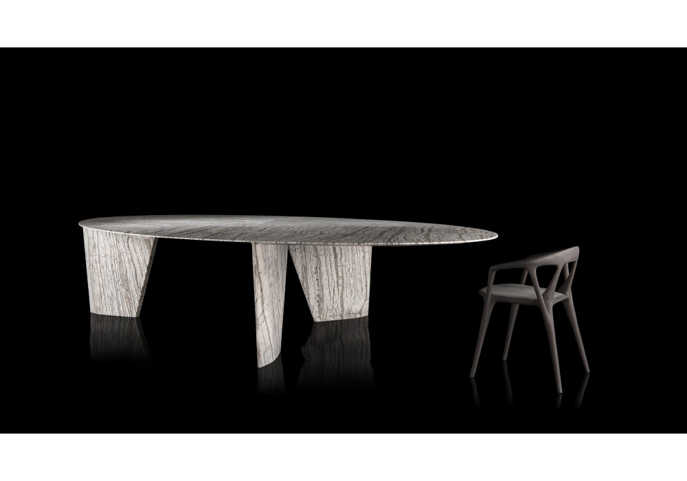 Synapse designed by Massimo Castagna for Henge is a table made with a tubular structure in black painted steel and top and legs in stone or wood. Available in different finishes and dimensions.