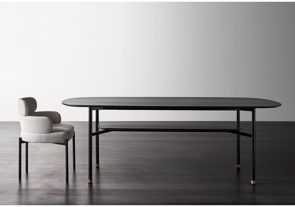 Hubert designed by Andrea Parisio for Meridiani is a table collection with under top. Matt black varnished metal base. Tip in varnished bronzed brass or platinum steel. Top available in the following finishes: stained oak veneer (with right edge) matt, glossy lacquer and marble (with shaped edges).