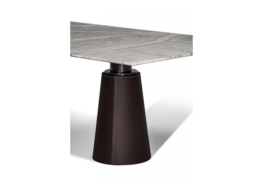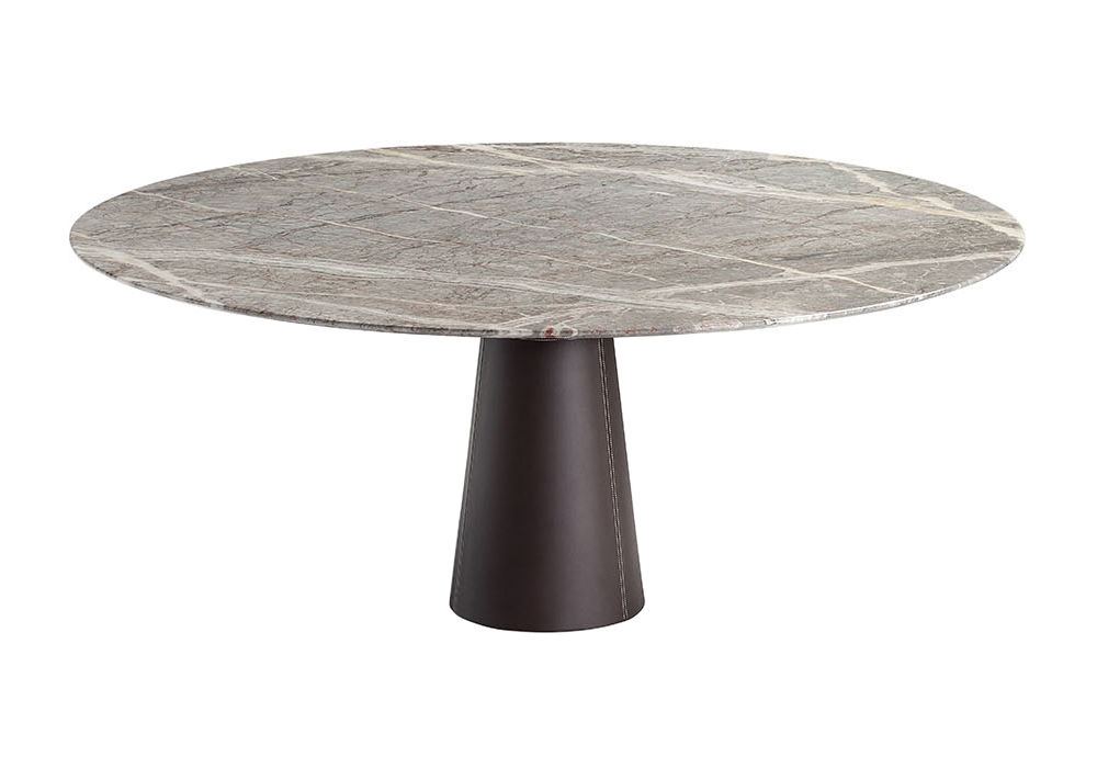 Mesa Due designed by Lella and Massimo Vignelli for Poltrona Frau is a table with steel base covered in Pelle Frau SC or saddle leather and marble top. It is available in different round table sizes and in rectangular shape. The Ø180 cm version is also available with Lazy Susan.