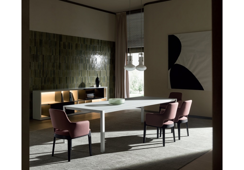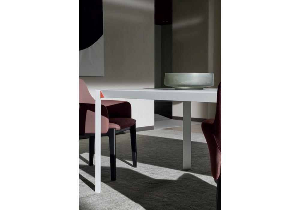 Half A Square White designed by Michael Anastassiades for Molteni&C is a table with a special finish, made with a lime white structure, a lime white etched glass top and a ruby red leg cover. Available in different dimensions.