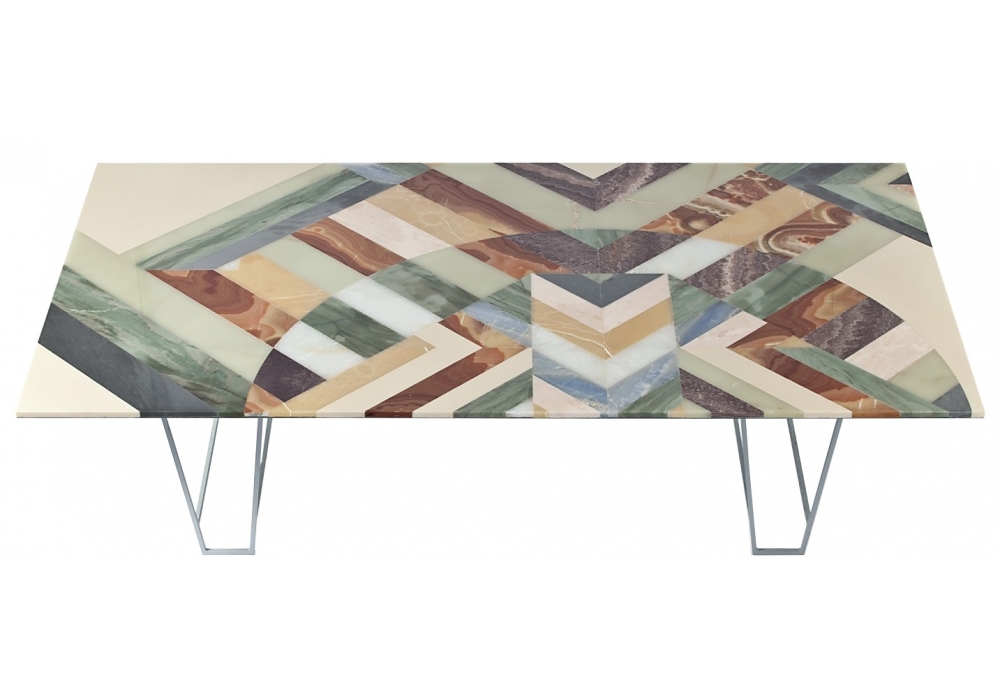 Earthquake designed by Patricia Urquiola for Budri is a table made with precious marbles and onyxes and cream-colored resins. The top rests on an aquamarine green lacquered iron foot.