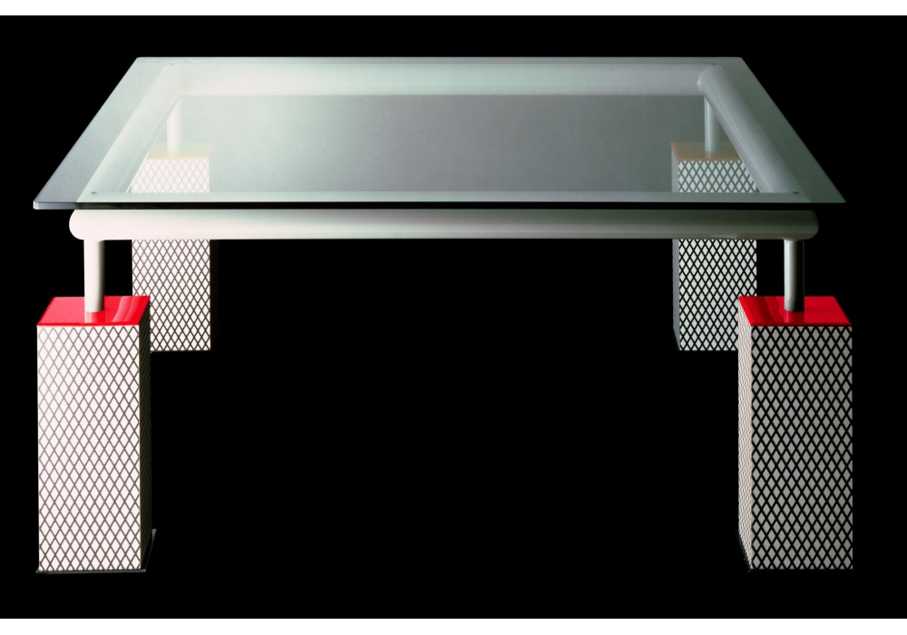 Mandarin designed by Ettore Sottsass for Memphis Milano is a table made of plastic laminate, metal and crystal.
