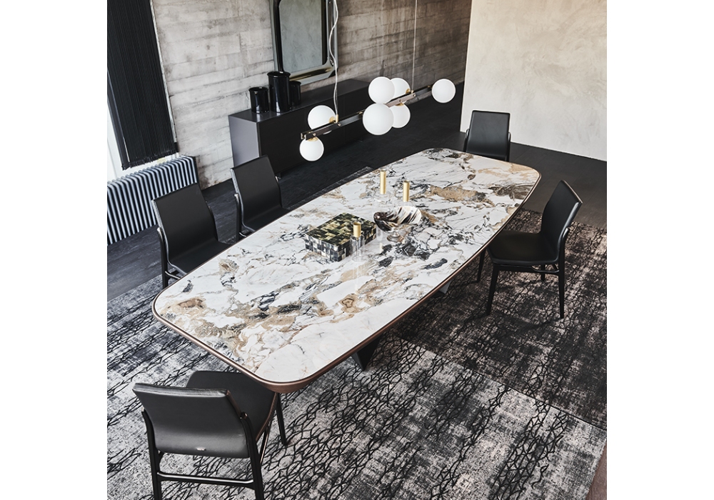 Skorpio Keramik Premium designed by Paolo Cattelan for Cattelan Italia is a table made of embossed lacquered steel base and top in ceramic Marmi in several colours with Brushed Bronze or Brushed Grey lacquered and rounded lower profile. 6cm thick top on 160x160 and 300x128 versions and 5cm on 200x120 and 240x120 versions.