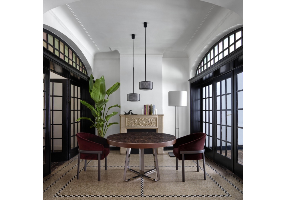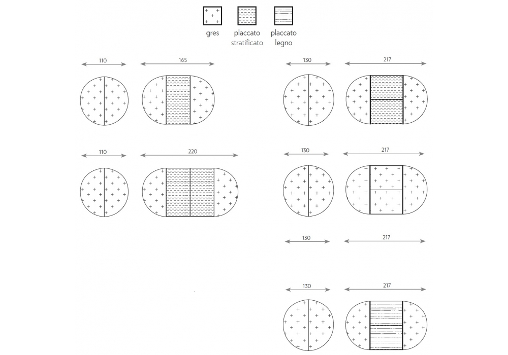 Where the tops are in ceramic stoneware with Emperador marble effect, the extension is either matched to the tops or in dark walnut veneered MDF.
