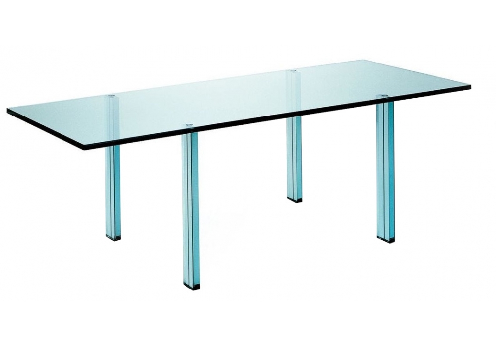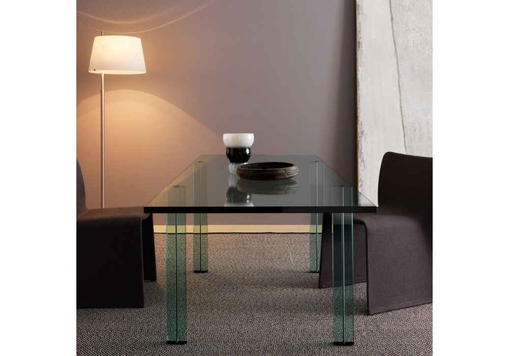 Teso designed by Renzo Piano for Fontana Arte, is a structured table entirely in stratified and ground float glass 25 mm thick. The legs are always in 38 mm thick stratified float glass sheets, with grooves for inserting painted metal tie rods.