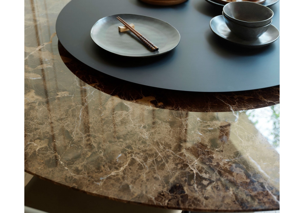 Barbara designed by Renato Zamberlan for Casamania & Horm is a table made with base in molded concrete and top in marble or Fenix or veneered MDF. Lazy Susan in black Fenix. Available in different finishes and dimensions.