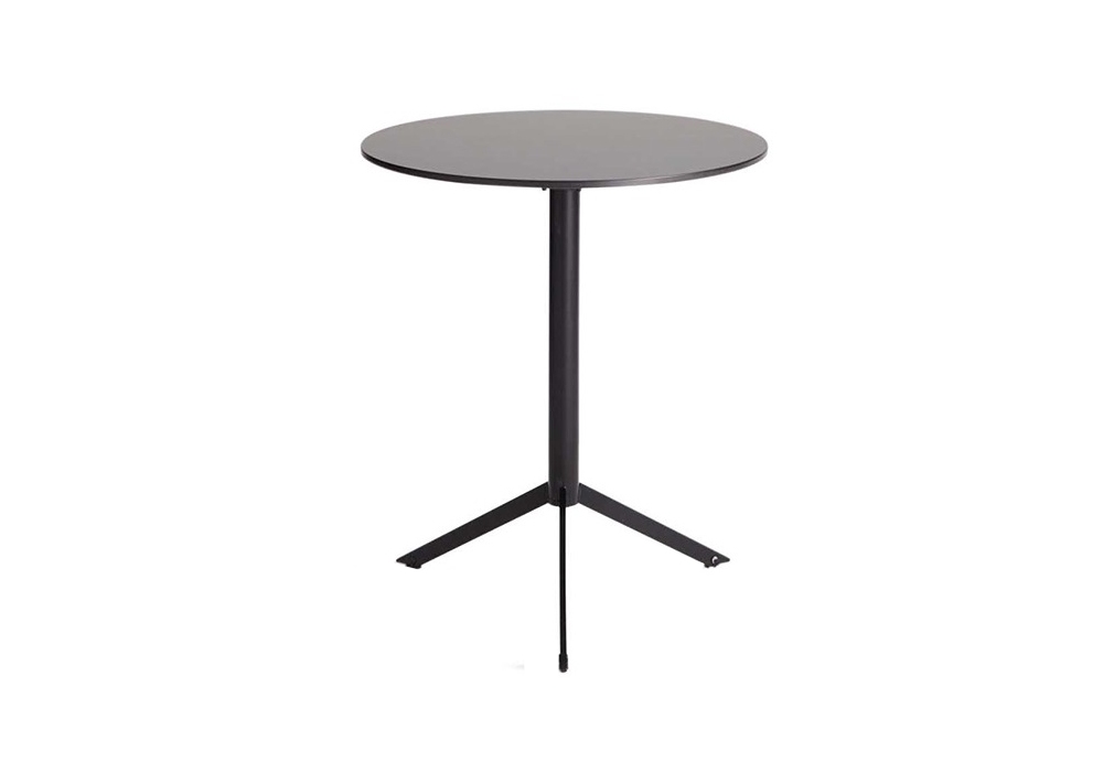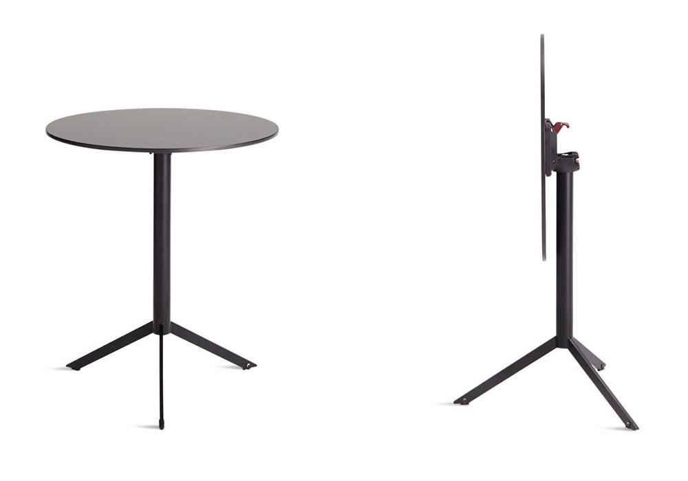 T4 designed by Casamania & Horm is a folding and stackable bistrot table. The top can be tilted 90 ° to allow the table to be stacked horizontally and can be locked by means of a special lever below. Painted metal structure and round or square layered HPL top. In the white version, the border of the HPL is black. Available in 2 finishes.