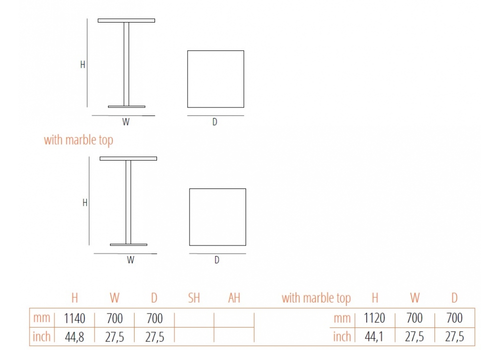 | Dimensions | • 70 x 70 x H 76 cm; • 70 x 70 x H 114 cm |
