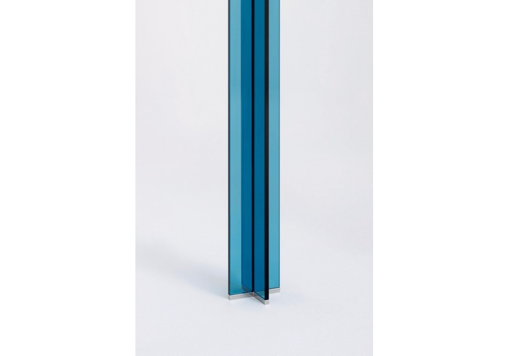X-T designed by Piero Lissoni for Glas Italia is a high table with a square, round, oval or rectangular shape with top in transparent extralight glass mm 15, or in smoked or blue glass in layered paste 8 + 8 mm. The legs, in extra-clear, smoked or blue 10 mm tempered glass, glued to UV, are removable and fixed to the top by means of sophisticated pairs of plates, made of mirror-polished stainless steel. The table is finished at the bottom by four feet in mirror polished stainless steel, perfectly integrated into the shape of the legs. Available in different sizes.