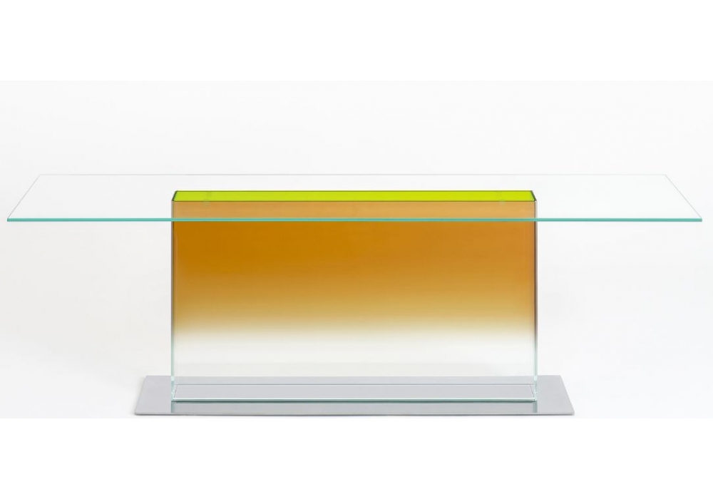 Donald designed by Philippe Starck for Glas Italia is a table made of 5 + 5mm layered extralight. The base is composed of a thick mirror-polished stainless steel plate, surmounted by a volume in colored transparent glass, glued at 45 °, in which the color fades and slopes until it dissolves and vanishes. It is possible to choose between the version with a gradient that slopes downwards, or upwards, in different finishes. Donald is made in various sizes.