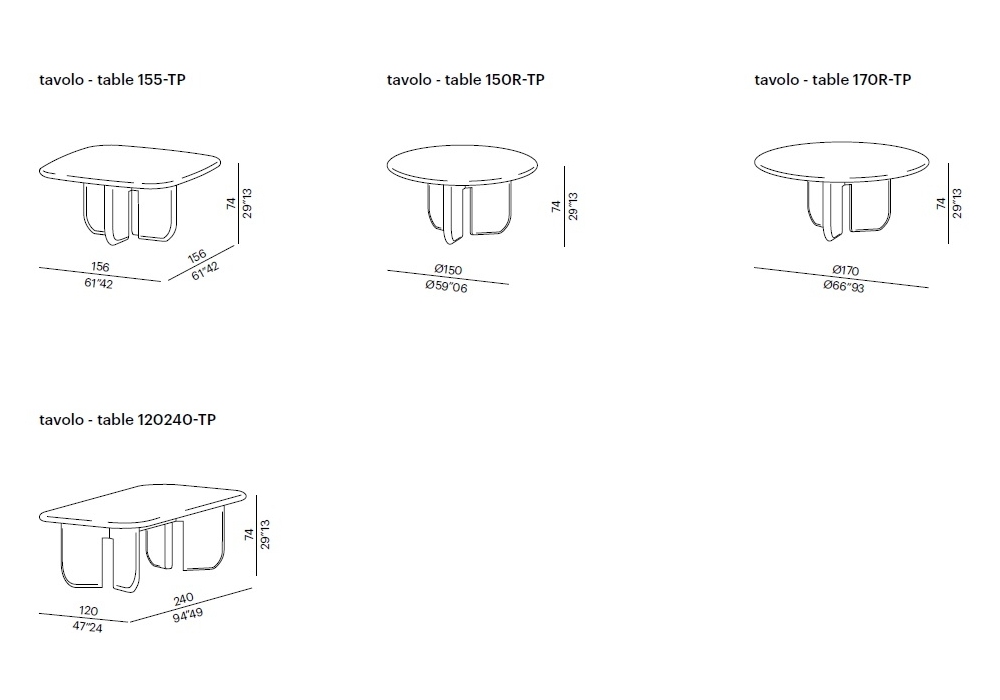 | Dimensions | Ø 150 cm x H 74 cm; Ø 170 cm x H 74 cm. |