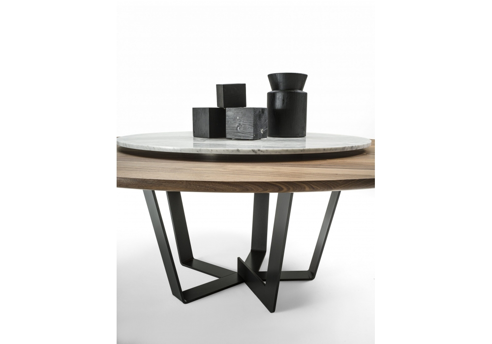 Kohi Table designed by Terry Dwan for Riva 1920 is a round table made with solid wood top with the addition of a wooden or marble support tray, equipped with a Lazy Susan swivel system. Characterized by an iron radial base. Available in different finishes and dimensions.