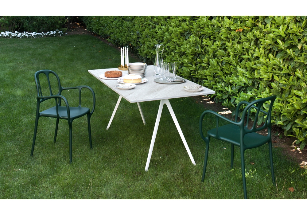 Baguette designed by Ronan & Erwan Bouroullec for Magis is a table with legs in die-cast aluminum polished or painted in polyester, crosspiece in extruded aluminum profile polished or painted in polyester. Available in different finishes and sizes.