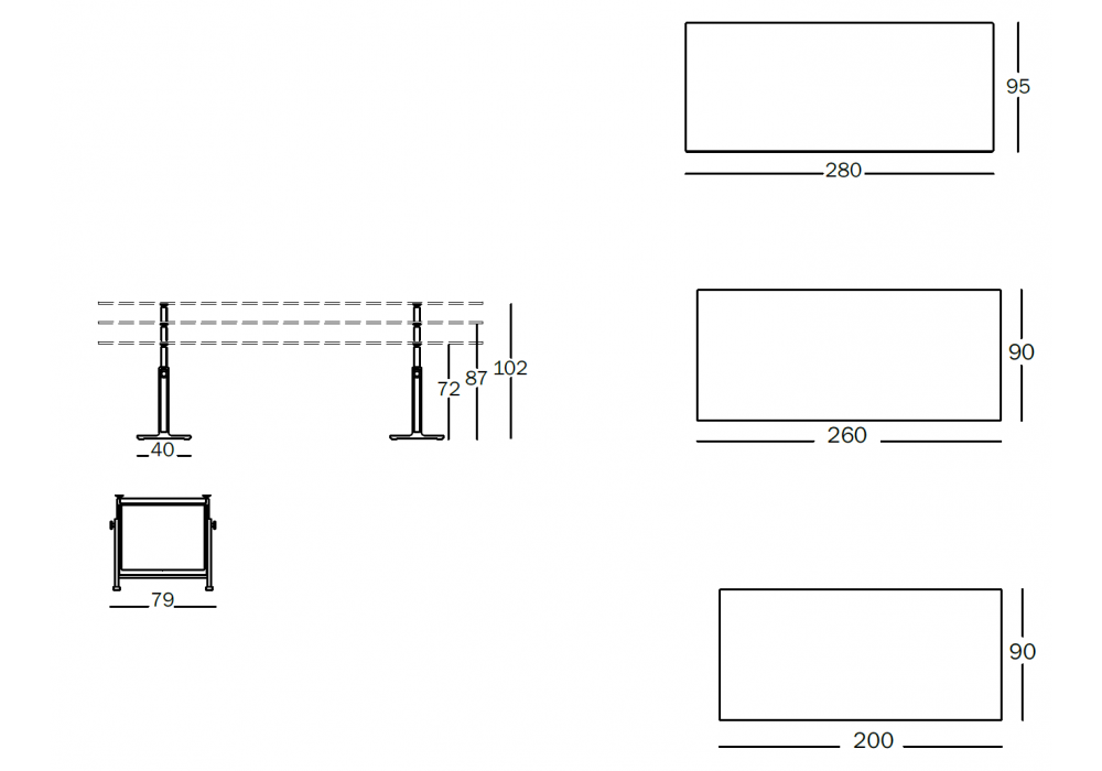 | Top | 200 x 90 cm; 260 x 90 cm; 280 x 95 cm. |