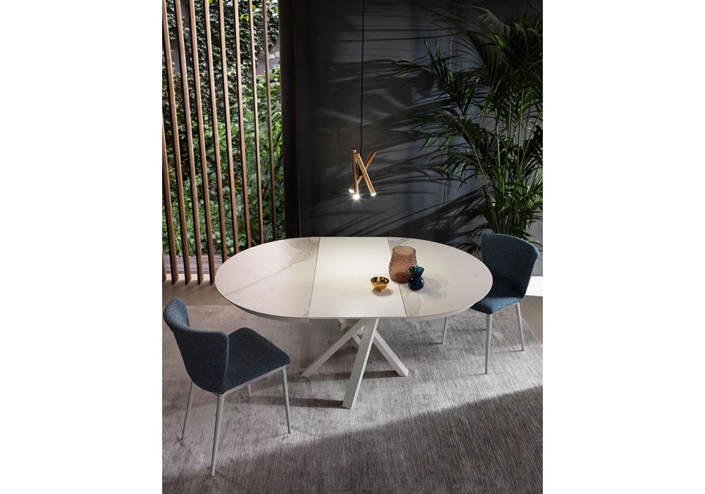 Round designed by Riflessi is a table with painted aluminum base and white or ceramic back-lacquered tempered glass top. Available in different dimensions. Internal extension in matt white lacquered wood in combination with white crystal and white ceramics, matt anthracite lacquered extensions with the other ceramics.