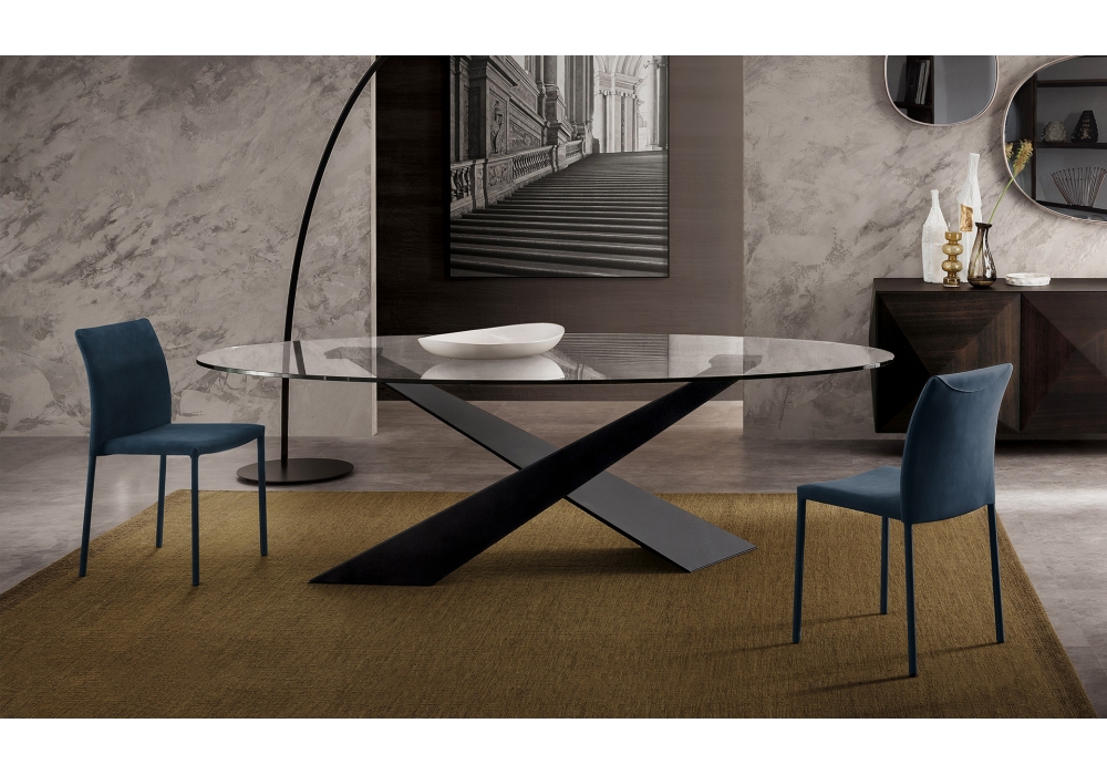 Living designed by Riflessi is a table with top made of extra-clear transparent tempered glass and aluminum base. Available in different dimensions.