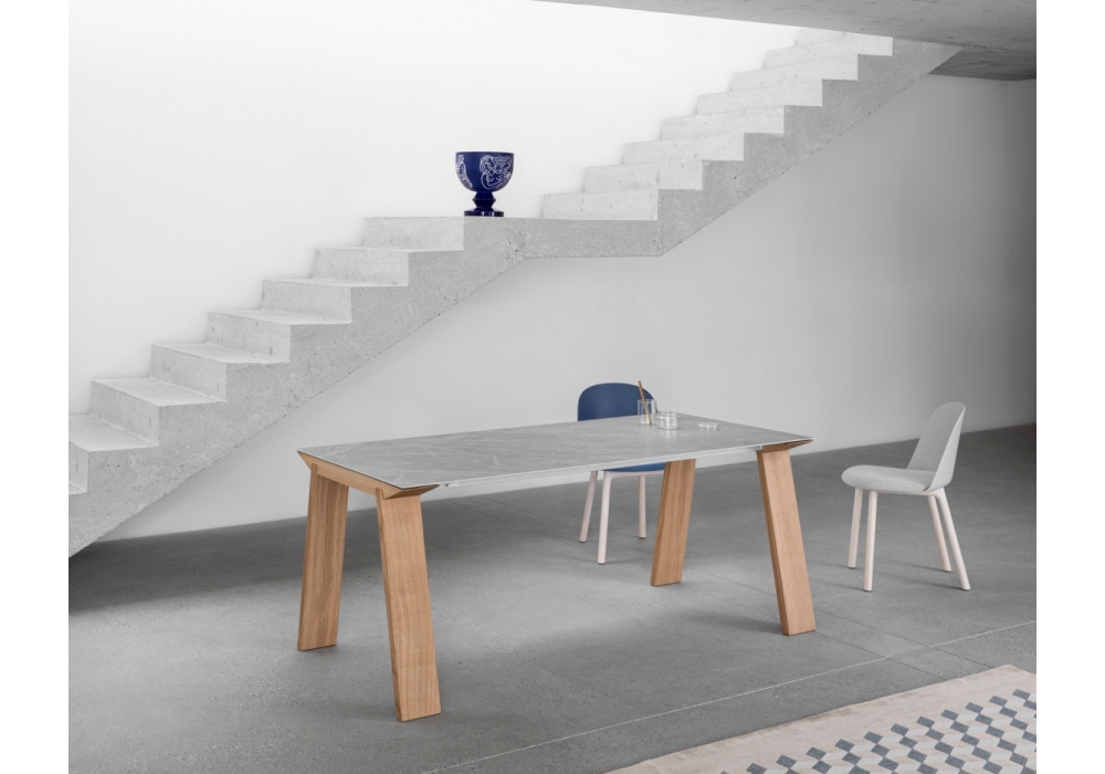 Artù designed by Andrea Lucatello for Miniforms is a table with legs in solid oak or lacquered, top in veneered essence on aluminum, in extra-clear satin-finish back-lacquered glass, in Fenix with wooden or ceramic edges. Available in fixed or extendable version.