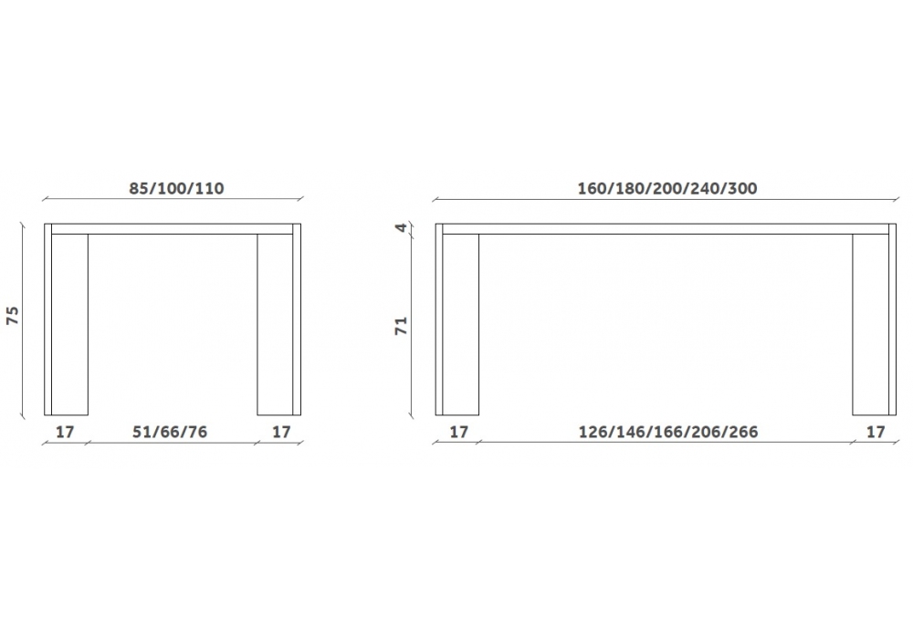 | Dimensions | • 160 x 85 x H 75 cm; • 180 x 100 x H 75 cm; • 200 x 100 x H 75 cm; • 240 x 100 x H 75 cm; • 300 x 110 x H 75 cm |