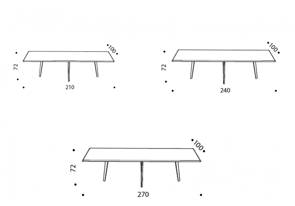 | Dimensions | - 210 x 100 x H 72 cm; - 240 x 100 x H 72 cm; - 270 x 100 x H 72 cm. |