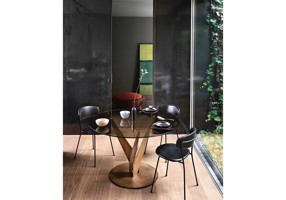 Epsylon designed by Fabio Di Bartolomei for Fiam is a table with top available in 10 mm-thick tempered glass or with 16mm layered glass (bronze or smoked). Cloudy metal or burnished brass finish metal base; stainless steel or brass fixing plates. Also available with customized top.