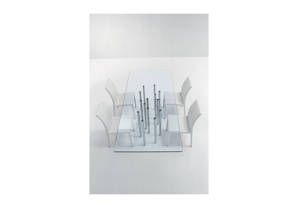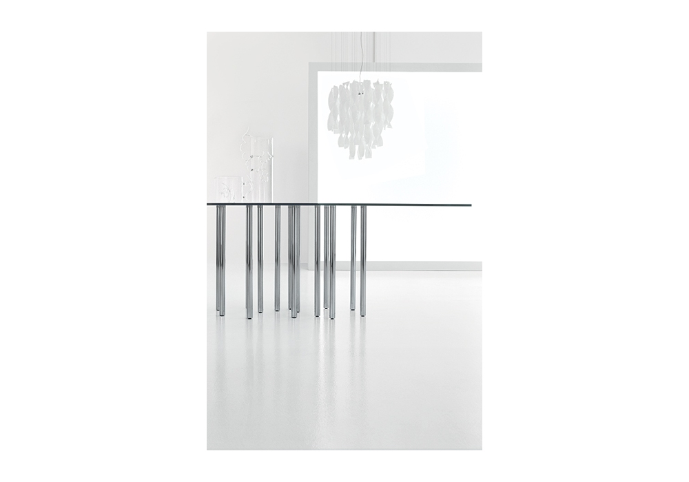 Mille designed by Bartoli Design for Bonaldo is a rectangular table with transparent glass top and chromed metal structure. Available in different sizes.