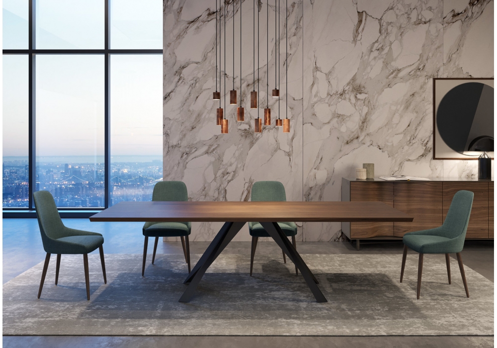 Bend designed by Christophe de Sousa for Gual Design is a fixed dining table with top in veneered ebony, walnut, eucalyptus or oak, and legs in black painted iron with reinforcing grid. Available in different dimensions.