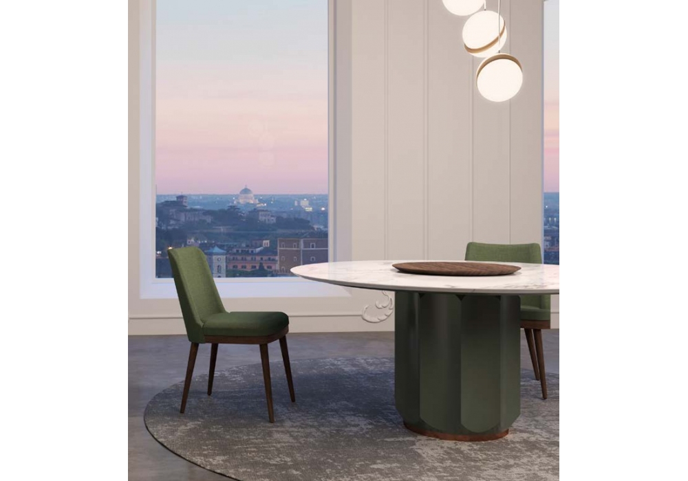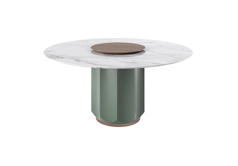 Ocean designed by Christophe de Sousa for Gual Design is a round dining table with structure in matt painted MDF with detail in the base in copper-plated iron. Top covered in ceramic or wood veneer. Also available in the Lady Susan version with turntable.