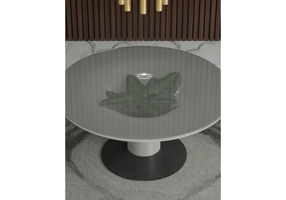 Scarlet designed by Gualter Torres and Albino Miranda for Gual Design is a round table with structure in fiberglass with acrylic resin. MDF base with rough resin texture. Gray glass top.