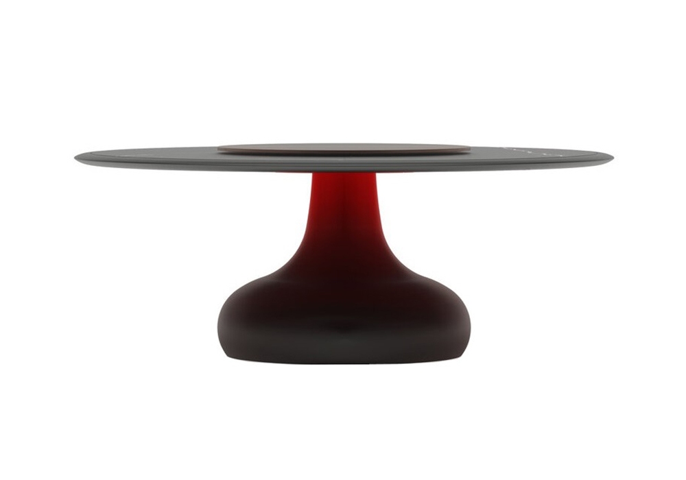 Berry designed by Gualter Torres and Albino Miranda for Gual Design is a round table with structure in fiberglass with acrylic resin and matt black lacquered top covered in ceramic. It is possible to add the revolving top in veneered wood as an accessory. Available in different finishes.