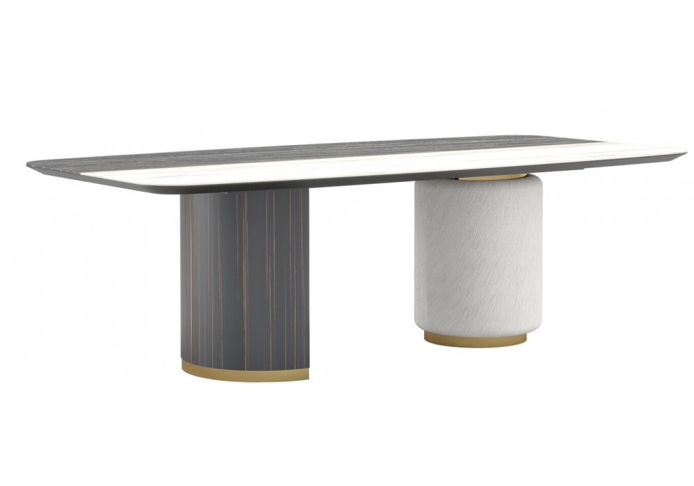 Megan designed by Gualter Torres for Gual Design is a table with structure covered with fabric and veneered ebony wood with rings at the ends made of gilded stainless steel. Black lacquered top, covered in ceramic. Available in different dimensions and finishes.