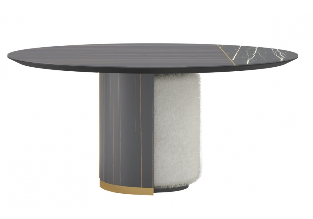 Megan Round designed and produced by Gual Design is a round table with structure covered in veneered ebony wood and fabric with a golden stainless steel ring at the lower end. Top covered in ceramic. Available in different finishes.