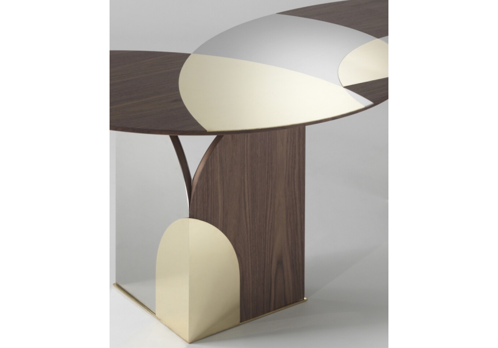 Selene designed by Emmemobili is a table made of veneered plywood and decorated with shiny brass and steel laminates. Available in two sizes and in different finishes.